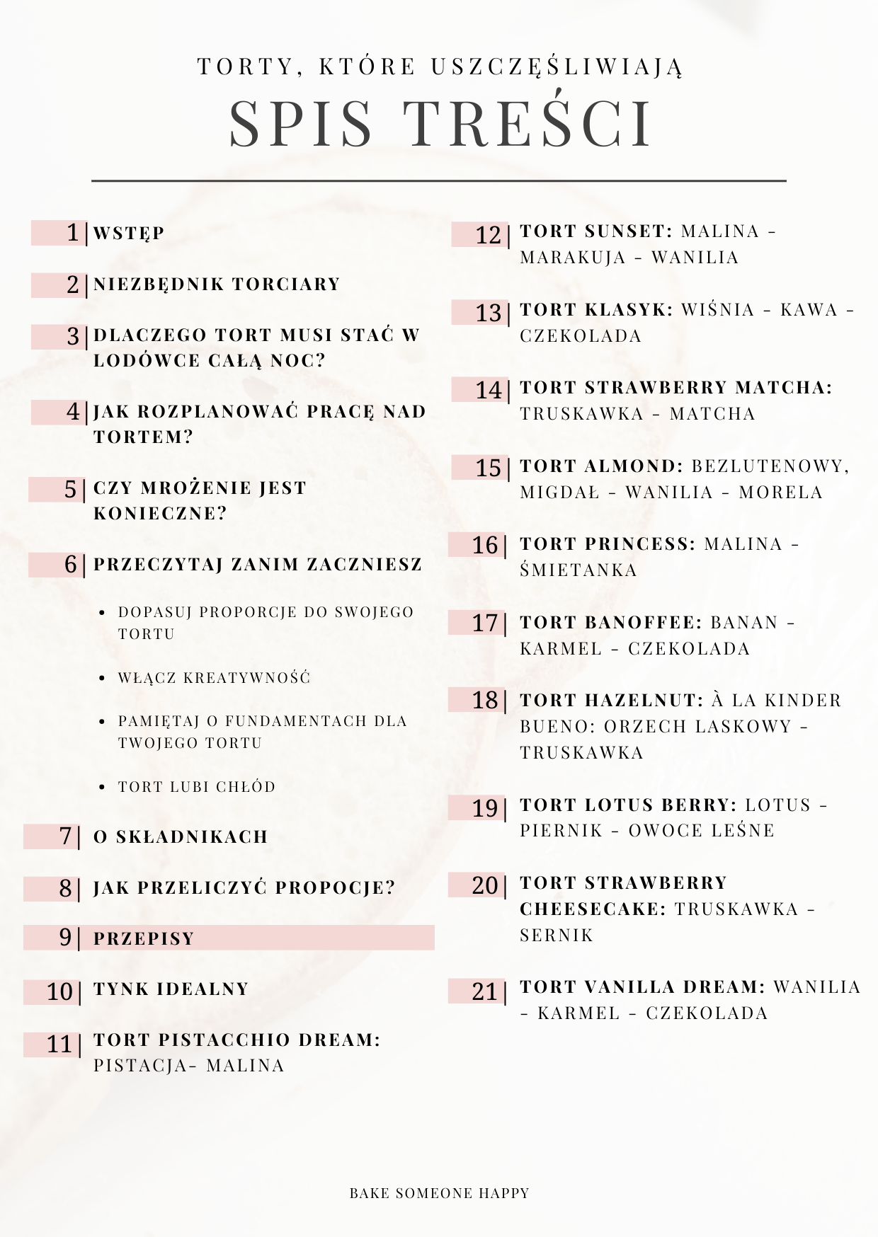 - Tabelę proporcji, która pozwoli Ci dopasować przepisy do dowolnej średnicy tortu.