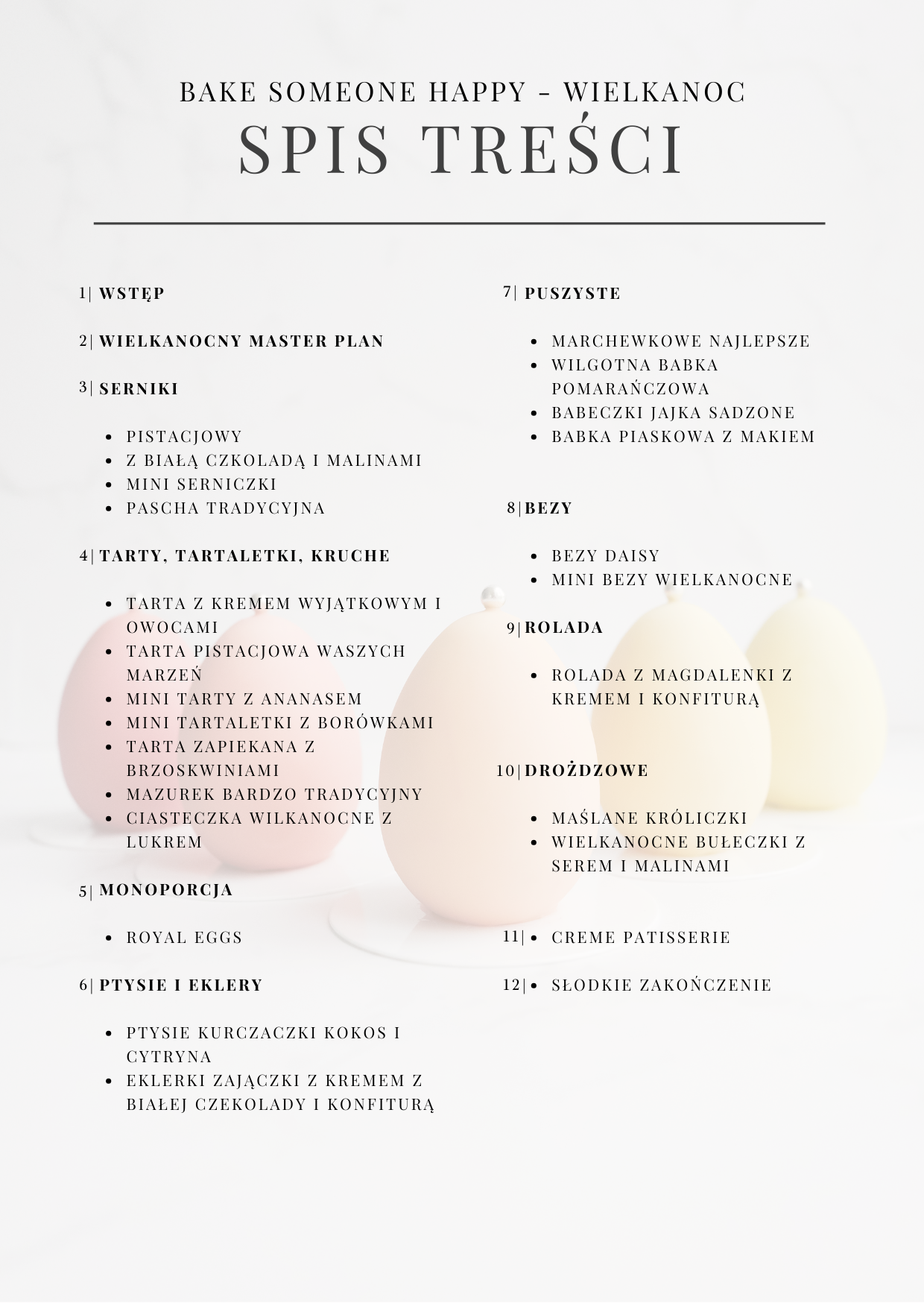 To 28 przepisów idealnych na świąteczny stół – od klasycznej paschy i mazurków po nowoczesne Royal Eggs. Znajdziesz tu także przepisy na serniki, kruche tarty, babki, bezy, ptysie, drożdżowe króliczki i wiele innych słodkich inspiracji. Każdy przepis jest szczegółowo opisany, dzięki czemu z łatwością przygotujesz wspaniałe wielkanocne wypieki, które zachwycą rodzinę i przyjaciół.